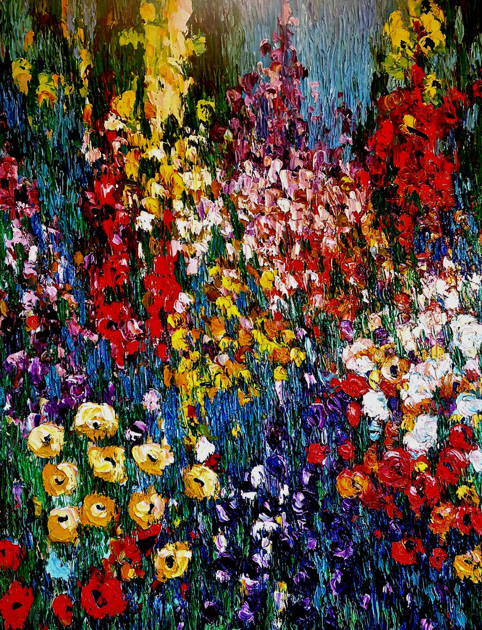 Ana’s creative focus lies in producing one-of-a-kind abstract works, exploring the limitless language of expressionism. Each piece is a labor-intensive process, taking anywhere from one week to three months to complete, depending on its size and subject matter. Her technique involves building dense, tactile textures in multiple layers, emphasizing both depth and detail.